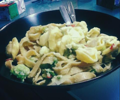 Ihanaa, kun kaupasta sai ostaa tuoreita yrttejä ja maustekasveja. HeVi-osasto suorastaan huusi minun nimeä kun astuin kauppaan. Valkosipulia, chiliä, limeä, persiljaa, basilikaa ja avokadoa. Jälkiruuaksi mukaan tarttui myös hollantilaisia mansikoita. Pasta oli juuri niin hyvää kuin on annettu ymmärtää, lime toi ihanan raikkauden, avokado taas pehmeyden, chili ja valkosipulit antoivat potkua ja yrtit syvyyttä, juustot vahvistivat rakennetta. Pastaksi valitsin täysjyvätuorepastan ja prosciutto-täytetyt tortellinit, tuoreversiona nekin. Namnamnam!